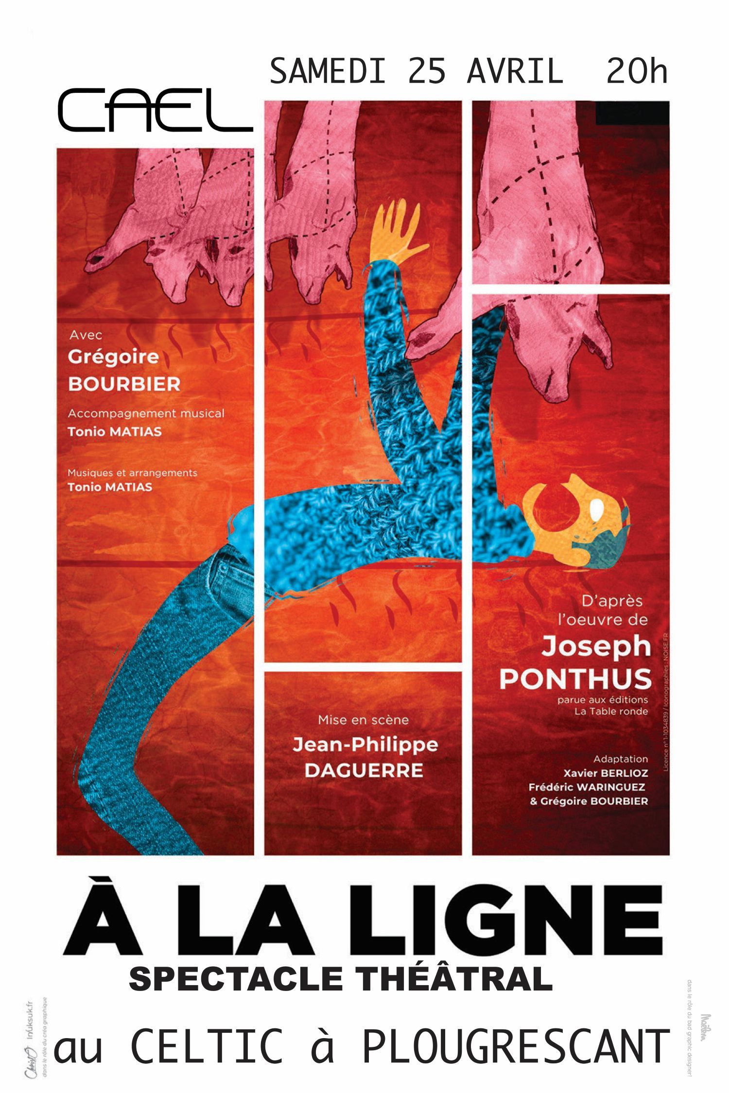 "A la ligne", représentation théâtrale, hommage à Joseph Ponthus. Un spectacle donné au théâtre de la Huchette à Paris et repris spécialement à Plougrescant, extraits d"A la ligne" mis en scène par Jean-Pierre Daguerre et interprétés par Grégoire Bourbier, accompagné à la guitare par Tony Marshal.